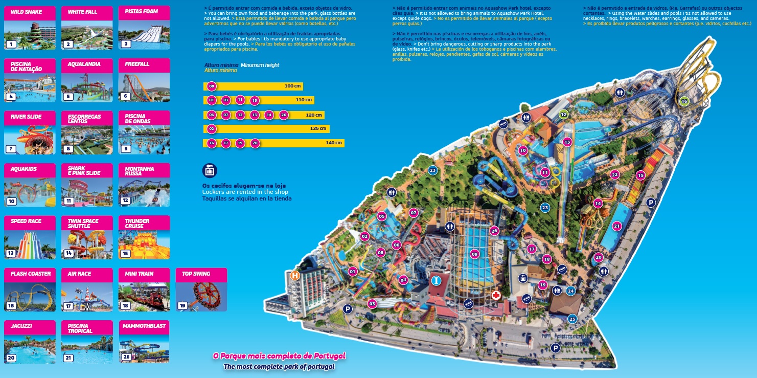 O Aquashow Park possui mais de 20 diversões emocionantes de diferentes tamanhos e níveis de dificuldade. Além disso, possui várias piscinas temáticas, como uma piscina de ondas, uma piscina de água quente e um rio lento para flutuar.
